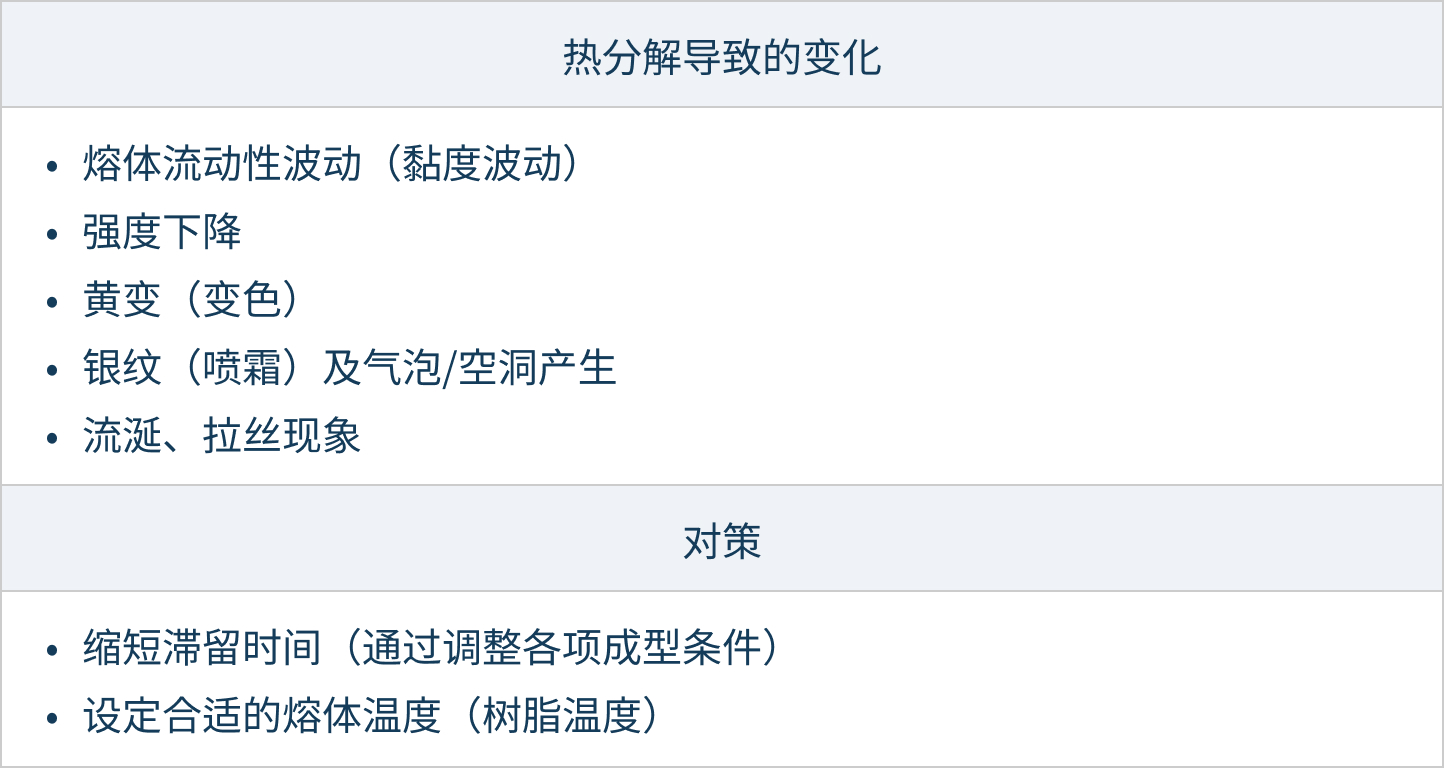 由于热分解与温度和时间密切相关,当成型温度高于必要水平,或树脂在成型机内的滞留时间过长时,更容易发生分解。