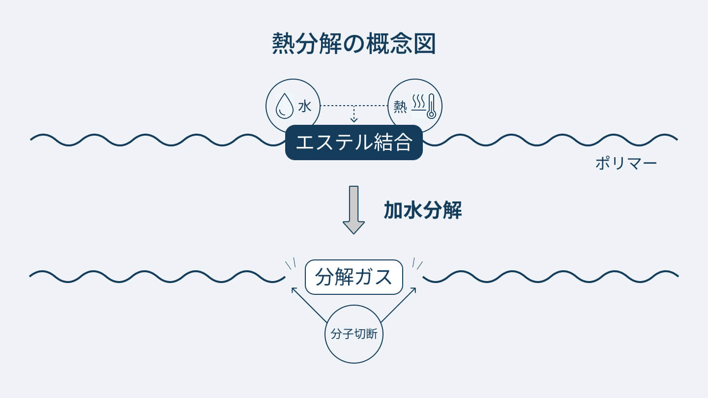 加水分解とは、ポリカーボネート樹脂やポリエステル樹脂などのように、分子中にエステル結合を有する材料が水と反応して、結合部が分子切断を起こす現象です。