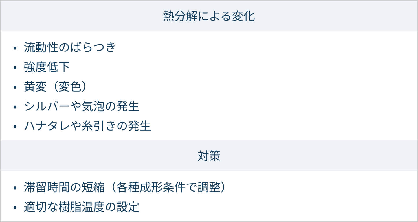 この分解に伴い、流動性のバラつきが生じ、強度が低下したり、シルバーや気泡の発生、ハナタレや糸引きなどの成形不良が生じたりします。