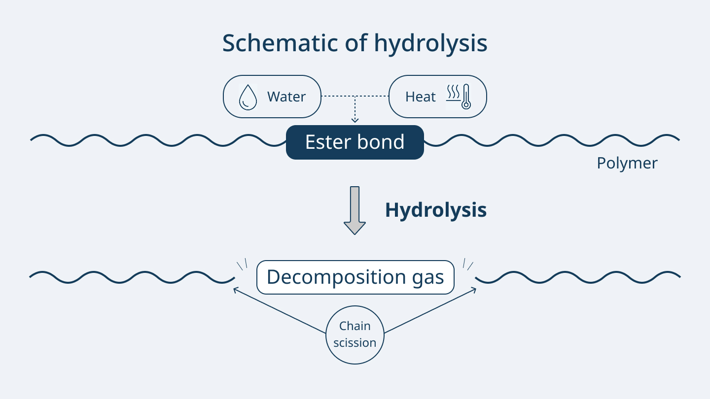 Hydrolysis is a phenomenon in which materials that contain ester bonds in their molecules—such as polycarbonate and polyester resins—react with water and the bonded sites undergo molecular chain scission.