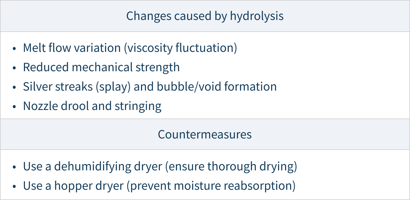 This degradation can cause variations in flowability, reduced strength, and molding defects such as silver streaks, bubbles, drooling, and stringing.